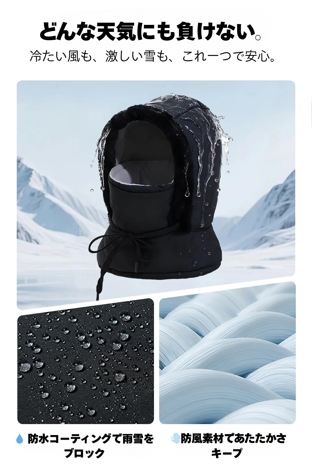 ウィンターガードは先進の防寒設計で、冷たい風や雪から頭部・首元をしっかりガード。一日中あたたかく快適に過ごせる安心をお届けします。